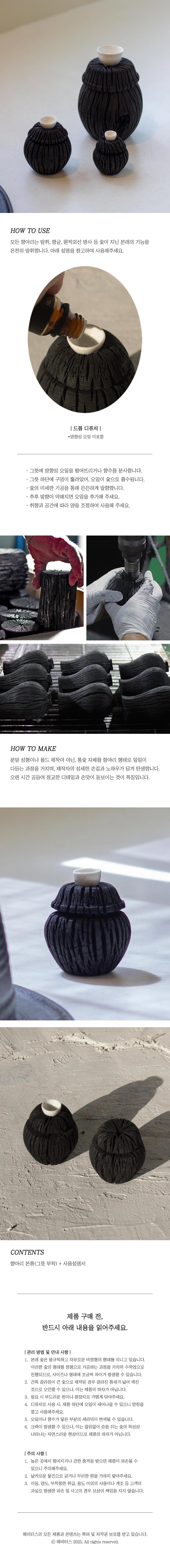 - 디퓨저로 사용 시, 제품 하단에 오일이 새어나올 수 있으니 받침을 깔고 사용해주세요.