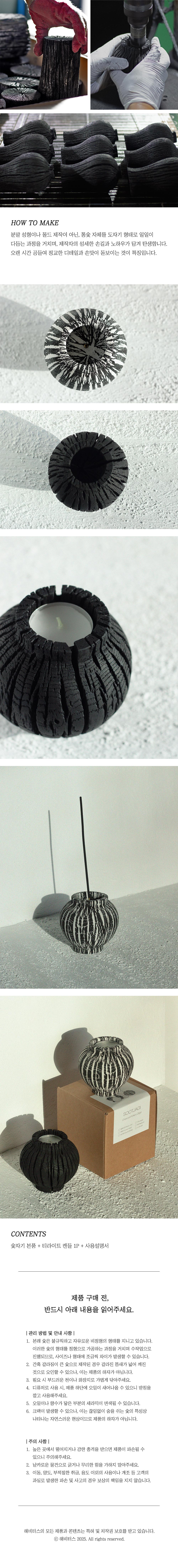 - 본래 숯은 불규칙하고 자유로운 비정형의 형태를 지니고 있습니다. 이러한 숯의 형태를 정형으로 가공하는 과정을 거치며 수작업으로 진행되므로, 사이즈나 형태에 조금씩 차이가 발생할 수 있습니다.